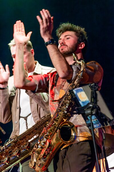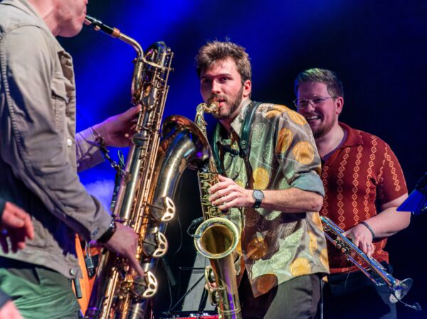 Maar het waren toch vooral de beide rietblazers die de show stalen. Tenorsaxofonist, tevens ‘musical director’ Max van Houtum bleek een echte klasbak, die scheurde, schmierde en honkte dat het een lieve lust was. Voor mij was het muzikale hoogtepunt het lange en spectaculaire duel tussen hem en collega rietblazers Jesse Schildering. Geen ‘tenorbattle’, maar een gevecht tussen de tenor en de bariton, die op punten werd gewonnen door de laatste.